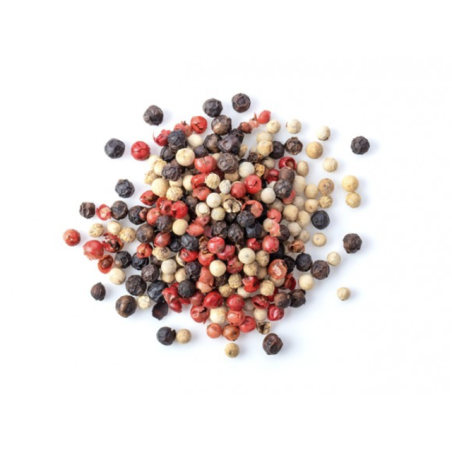 Ce mélange de poivre noir, blanc, vert, de baies roses et de coriandre est idéal pour vos sauces et plats.